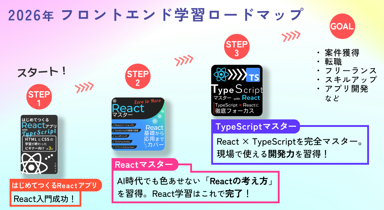 「React × TypeScriptマスター」を終えれば、2026年最新のReact + TypeScriptスキルに加え、 AI時代に通用する普遍的な力が身につきます。